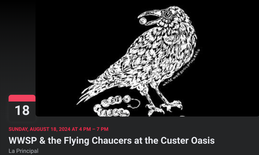 Ha. Our luck with the weather has not been all that great lately. Every outdoor show is a crap-shoot. We are hoping for sunny skies and mild temps. Who knows?! Back to the basics with The Flying Chaucers. On the street at The Custer Oasis 700 Main St. in Evanston. Suggested donation: $10. – Jammer