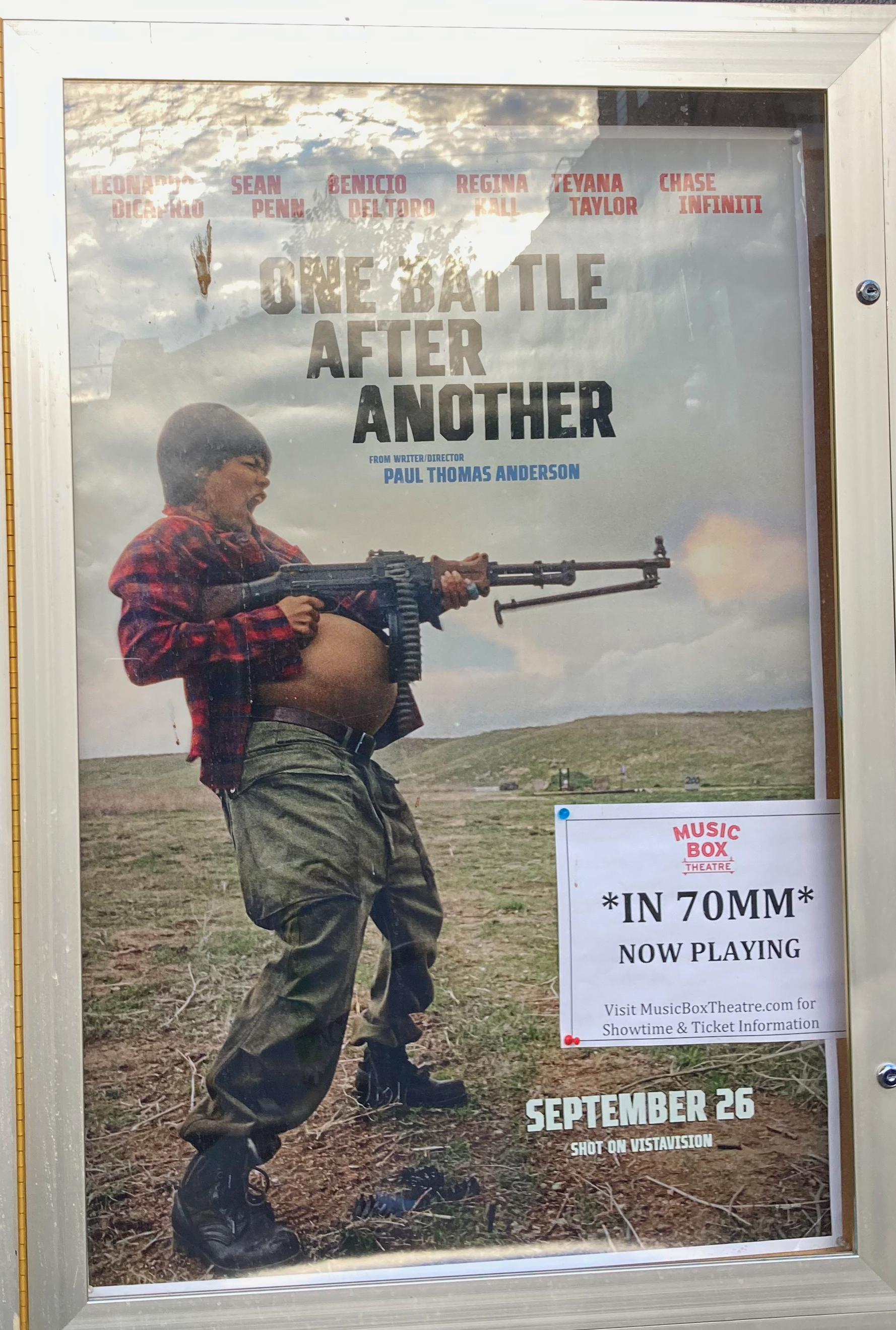 We went to a mid-afternoon showing of “One Battle After Another,” the new film by the master filmmaker PT Anderson.  Is it a fabulous, engaging, intelligent, beautifully filmed, perfectly-pitched entertainment? Yes, indeed. It was playing at the Music Box Theater, a classic movie-palace which, believe it or not, opened in 1929. It’s been updated and refurbished with comfy seats, a great sound system and the capabilty of showing films in 70mm. Astonishing & good.