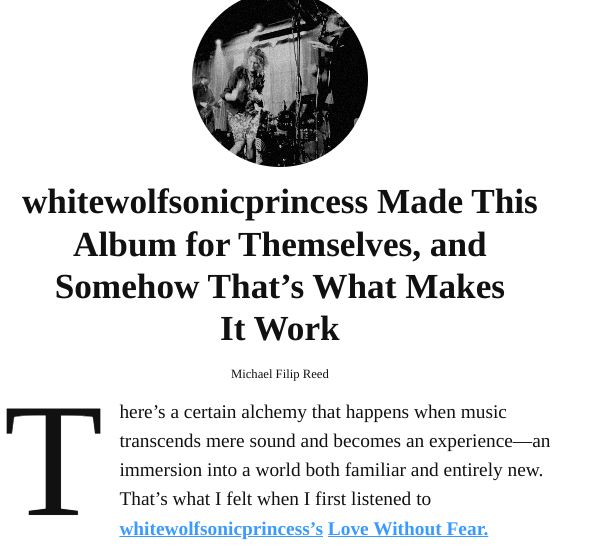 What sets WhiteWolfSonicPrincess apart is their ability to weave narratives into the music without losing an ounce of visceral impact. Each track unfolds like an incantation, with poetic lyricism that resonates deeply. The interplay of voices—sometimes haunting, sometimes soaring—adds to the album’s otherworldly feel, reinforcing its ability to transport listeners to a place where sound and spirit merge.
