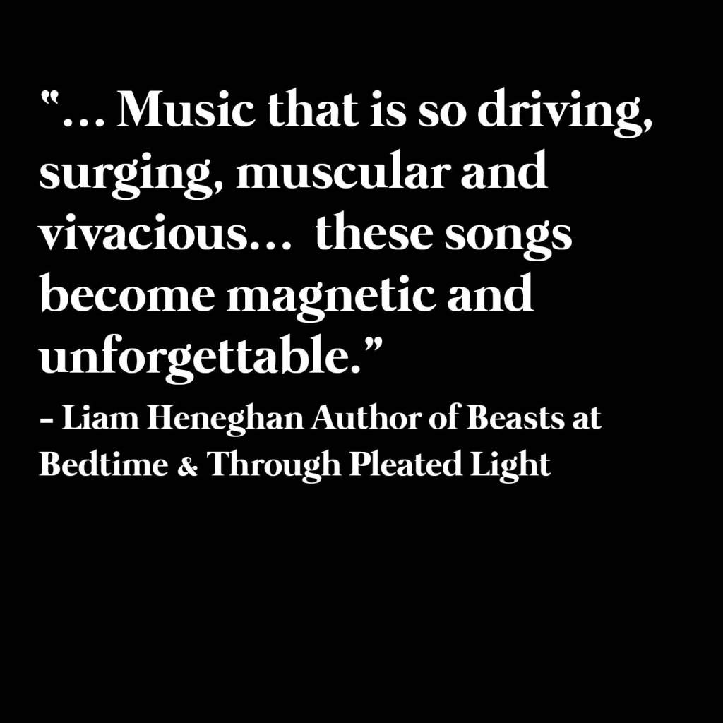 “… Music that is so driving, surging, muscular and vivacious… these songs become magnetic and unforgettable.” – Liam Heneghan Author of Beasts at Bedtime & Through Pleated Light